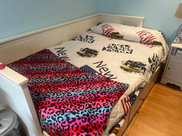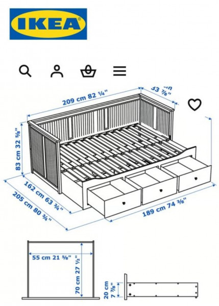 Cama nido del Ikea con somier extensinble. La cama es de 90, pero con la extensión se convierte en una cama de 1'20. De hecho, se vende con colchón de 1'20. Tiene tres cajones grandes para almacenaje. Las dimensiones se adjuntan en una foto.