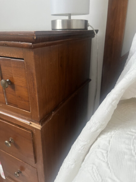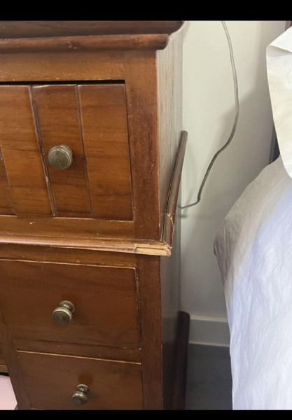 Mesilla madera de teca con un pequeño defecto en una esquina, como se muestra en la foto.