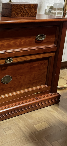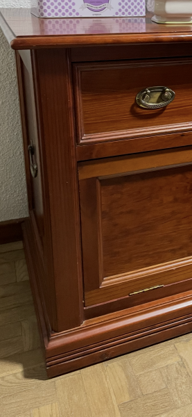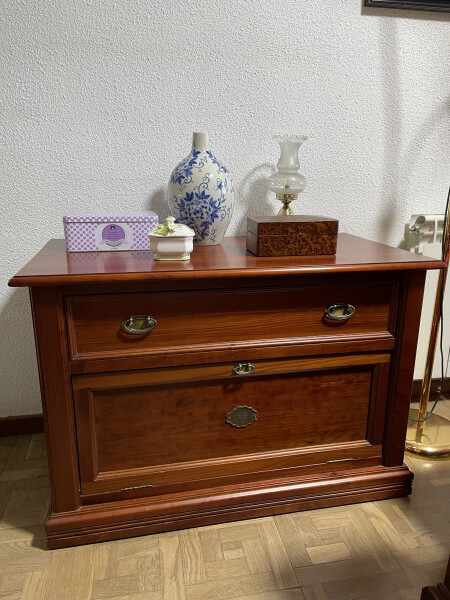 Fabricado en madera de alta calidad, presenta un acabado brillante en tono caoba que aporta calidez y presencia. Su estructura cuenta con un compartimento abatible de gran capacidad, perfecto para guardar documentos, carpetas o artículos personales, manteniendo el orden con un toque decorativo.