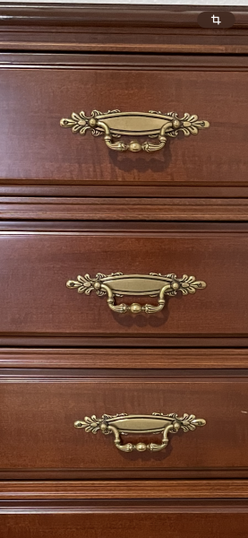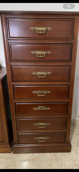 Fabricado en madera de tono caoba, presenta una estructura robusta y bien cuidada, con siete amplios cajones que permiten organizar ropa, complementos o documentos con comodidad. Los tiradores metálicos en color dorado envejecido aportan un toque refinado que realza su encanto clásico.