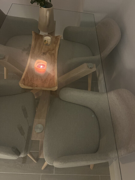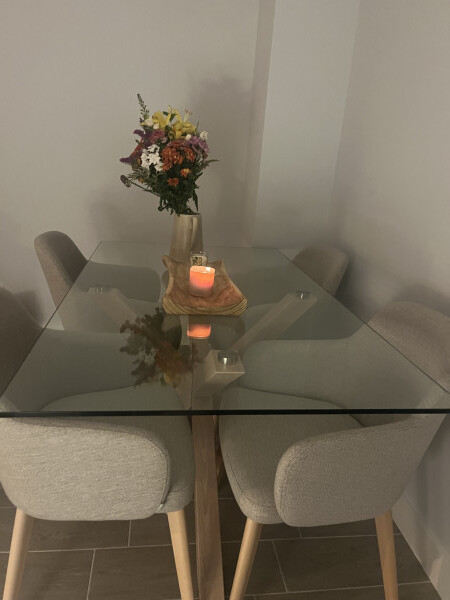 Mesa de comedor de cristal con patas de madera de la marca Kave Home. Tiene un pequeño defecto que apenas se aprecia en el cristal. Muy buen estado, apenas tiene un año de compra y muy poco uso