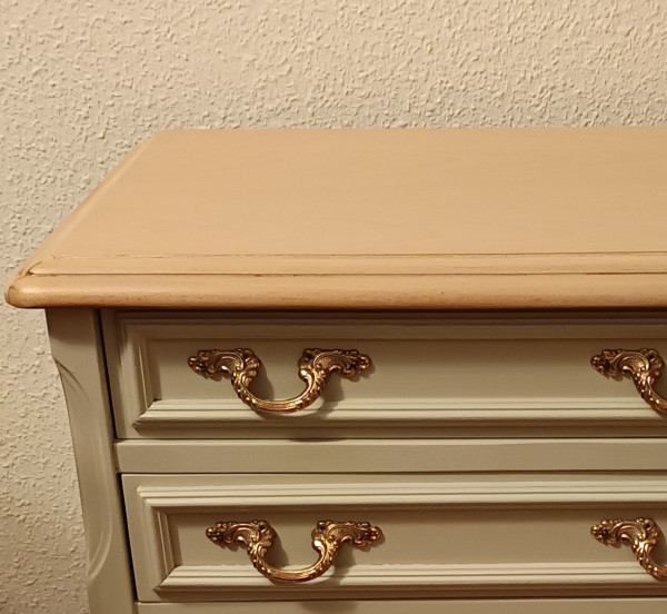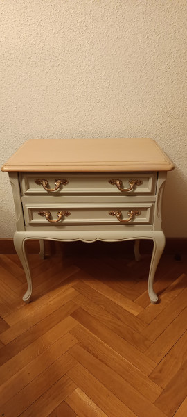 Esta es una mesita afrancesada de madera, con patas curvas, con dos cajones, en color beige, y con la tapa en madera