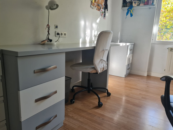 Habitacion infantil lacada en banco y gris, con literas, armario, cajones y dos mesas con cajonera y sillas de estudio.