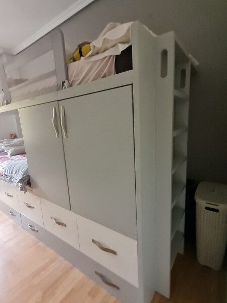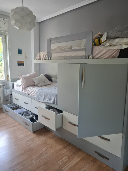 Es un conjunto de muebles pra habitacion infantil, ideal para optimizar espacio. Compuesto por litera con barra de seguridad, armario integrado de gran capacidad, amplios cajones en la base para ropa y zapatero asi como pequeños cajones en la cabecera pra ropa interior y calcetines. Ademas se venden dos amplias mesas de estudio con cajoneras y sillas giratorias.
