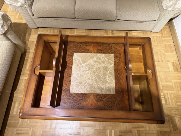 - Tablero principal de madera con detalles de veta.- Centro decorativo de mármol con un patrón único.- Bordes de madera pulida.