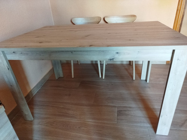 Mesa de comedor extensible hasta 180 cm. en perfecto estado. Su diseño combina tonos beige y marrón, aportando calidez a cualquier espacio. Robusta
