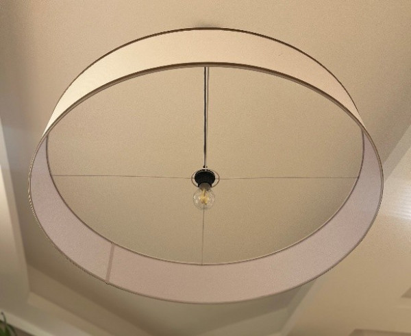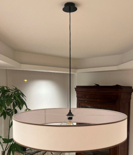 Elegante lámpara colgante de diseño Tragaluz. Su forma ovalada y acabados le dan un toque moderno a cualquier espacio. Tiene un diametro de 85 cms - Pantalla de tela. - Aro de metal.