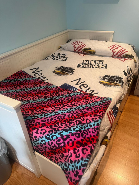 Cama nido del Ikea con somier extensinble. La cama es de 90, pero con la extensión se convierte en una cama de 1'20. De hecho, se vende con colchón de 1'20. Tiene tres cajones grandes para almacenaje. Las dimensiones se adjuntan en una foto.