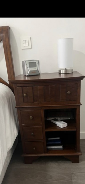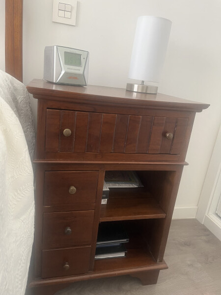 Preciosa mesilla madera de teca con un cajón grande Tres. Pequeños y dos baldas,