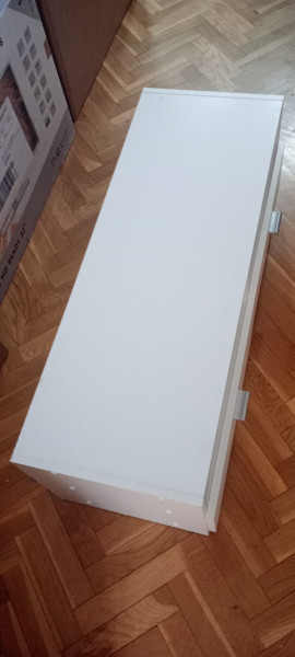 Mueble de TV en color blanco, de diseño moderno y líneas rectas. Es un mueble práctico y versátil, perfecto para salones pequeños, dormitorios o zonas de estudio.