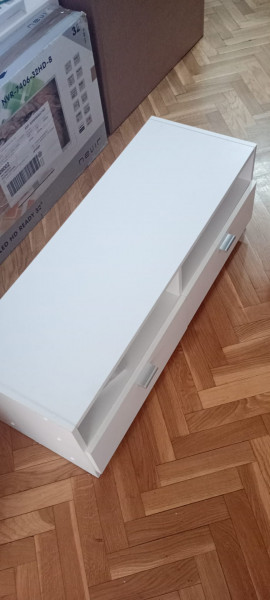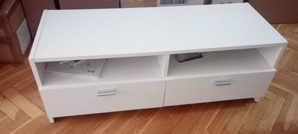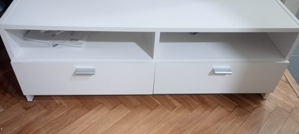 Mueble TV blanco con dos cajones y estante abierto – Ideal para salón o dormitorio