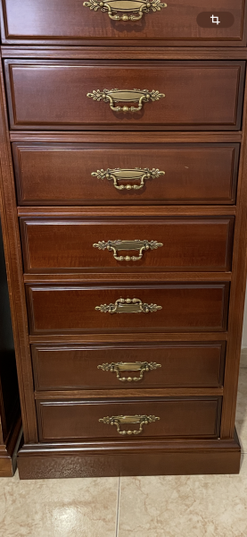 Fabricado en madera de tono caoba, presenta una estructura robusta y bien cuidada, con siete amplios cajones que permiten organizar ropa, complementos o documentos con comodidad. Los tiradores metálicos en color dorado envejecido aportan un toque refinado que realza su encanto clásico.