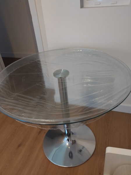 Elegante mesa de comedor con superficie de cristal y base metálica. Está nueva