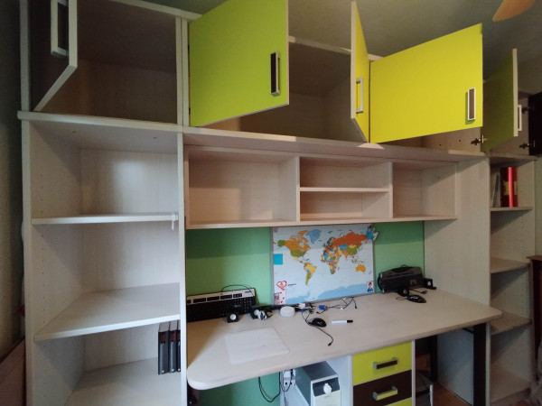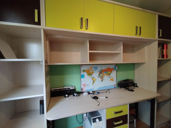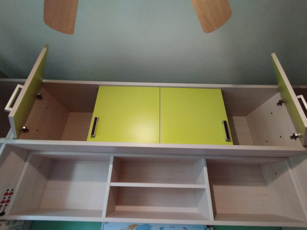 Mueble juvenil tipo puente que combina estantería, escritorio y cajonera. Ideal para organizar un espacio de trabajo o estudio. Gran capacidad de almacenaje en puente superior.