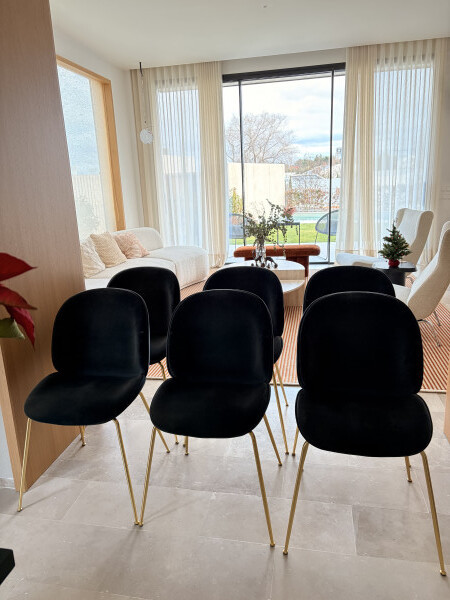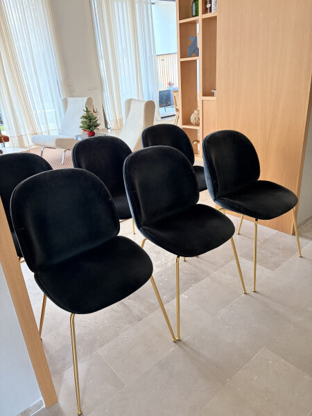 Sillas de Comedor de la marca danesa Gubi. Terciopelo azul y patas doradas. Excelente estado.